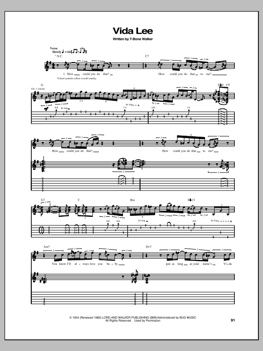 Download or print T-Bone Walker Vida Lee sheet music, chords and digital score arranged for Guitar Tab. This Blues score includes 4 page(s).