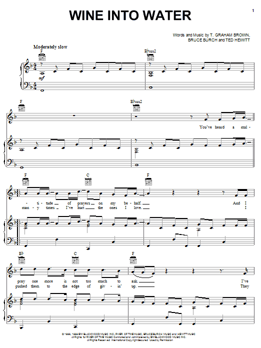 Download or print T. Graham Brown Wine Into Water sheet music, chords and digital score arranged for Piano, Vocal & Guitar Chords (Right-Hand Melody). This Country score includes 5 page(s).