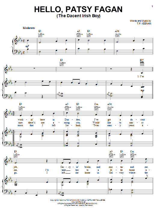 Download or print T.P. Keenan Hello Patsy Fagan (The Dacent Irish Boy) sheet music, chords and digital score arranged for Piano, Vocal & Guitar Chords (Right-Hand Melody). This Irish score includes 3 page(s).