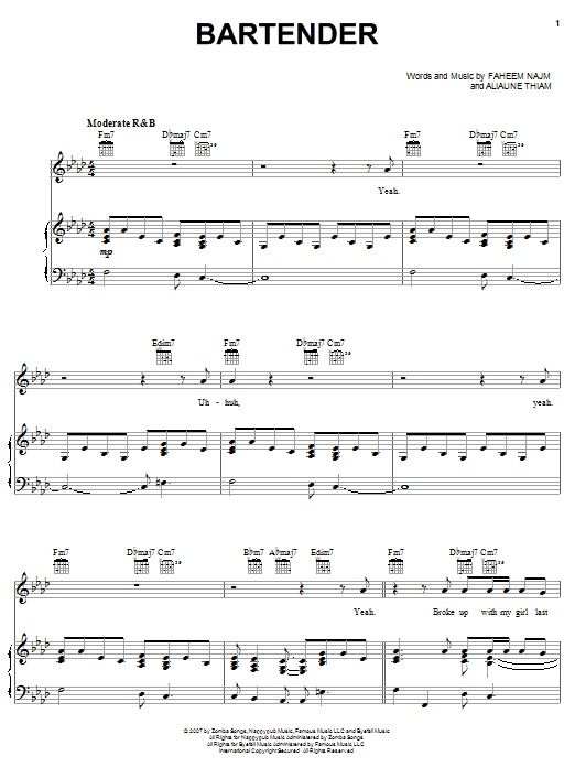 Download or print T-Pain featuring Akon Bartender sheet music, chords and digital score arranged for Piano, Vocal & Guitar Chords (Right-Hand Melody). This Hip-Hop score includes 10 page(s).