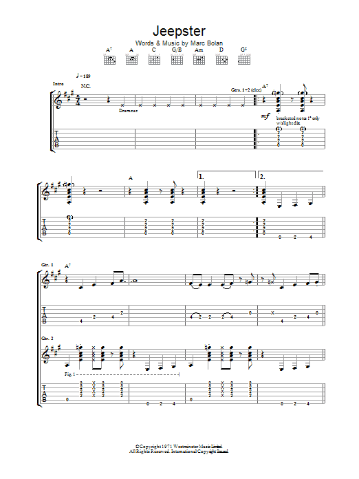 Download or print T. Rex Jeepster sheet music, chords and digital score arranged for Piano, Vocal & Guitar Chords (Right-Hand Melody). This Pop score includes 5 page(s).