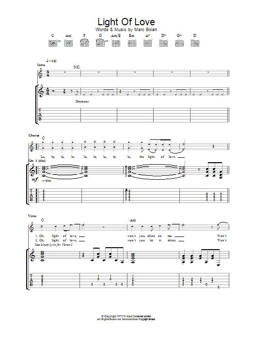 Download or print T Rex Light Of Love sheet music, chords and digital score arranged for Guitar Tab. This Pop score includes 4 page(s).