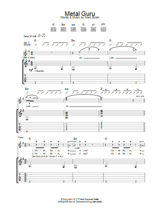 Download or print T Rex Metal Guru sheet music, chords and digital score arranged for Guitar Tab. This Pop score includes 4 page(s).