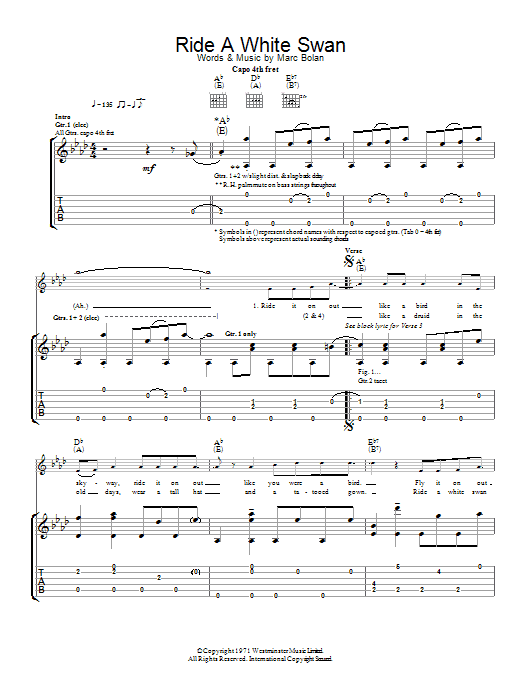 Download or print T. Rex Ride A White Swan sheet music, chords and digital score arranged for Guitar Chords/Lyrics. This Rock score includes 2 page(s).