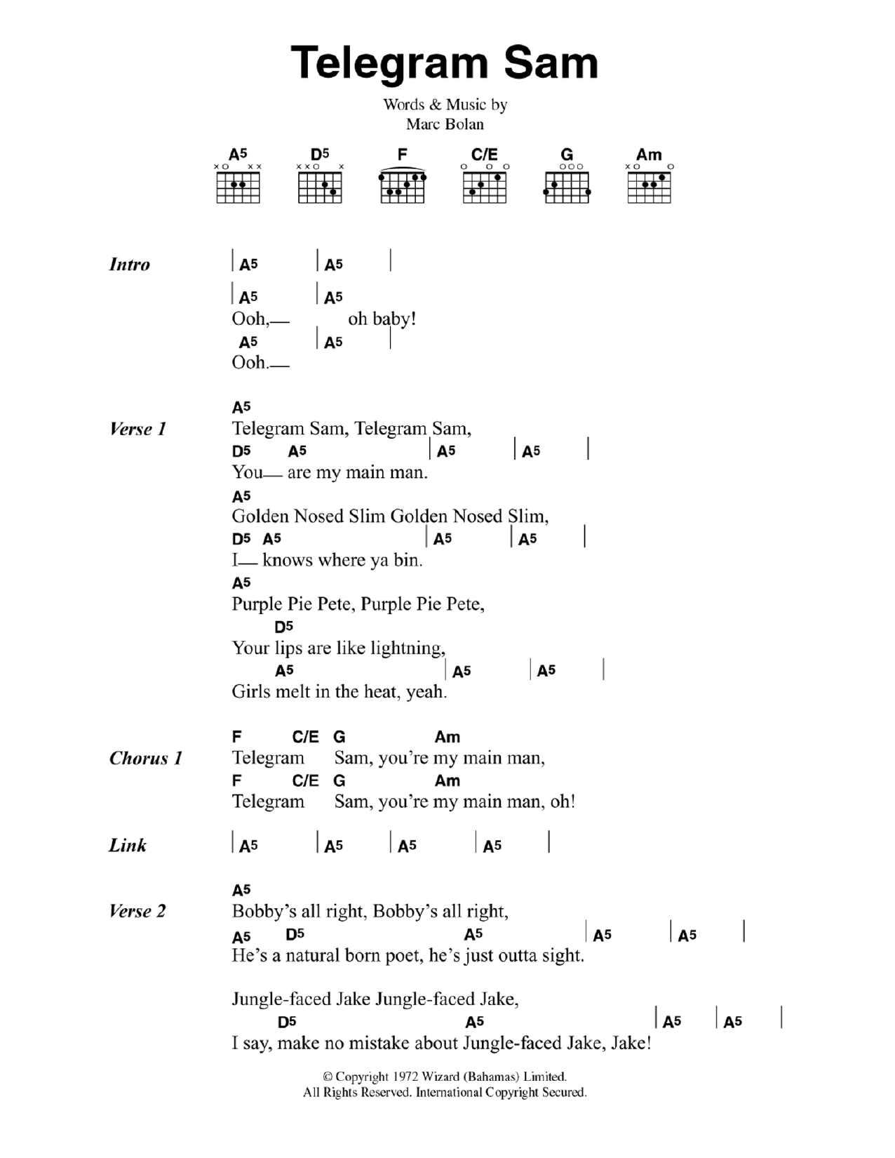 Download or print T Rex Telegram Sam sheet music, chords and digital score arranged for Guitar Tab. This Rock score includes 6 page(s).