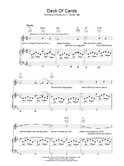Download or print T. Texas Tyler Deck Of Cards sheet music, chords and digital score arranged for Piano, Vocal & Guitar Chords. This Pop score includes 8 page(s).
