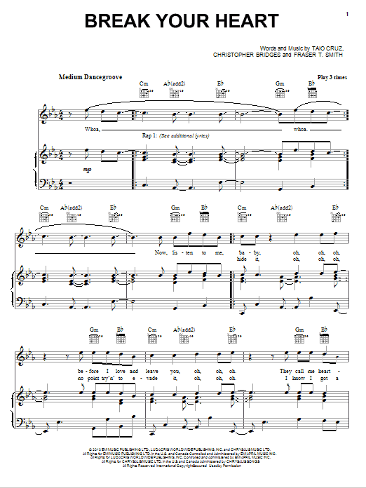 Download or print Taio Cruz featuring Ludacris Break Your Heart sheet music, chords and digital score arranged for Piano, Vocal & Guitar Chords (Right-Hand Melody). This Hip-Hop score includes 6 page(s).