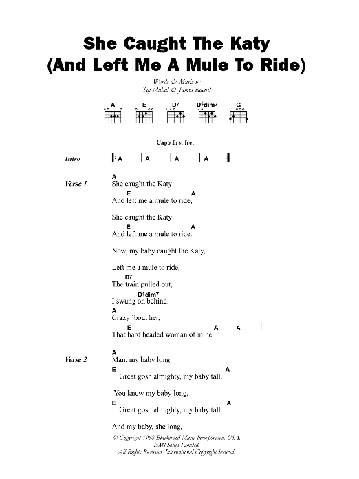 Download or print Taj Mahal She Caught The Katy (And Left Me A Mule To Ride) sheet music, chords and digital score arranged for Guitar Chords/Lyrics. This Blues score includes 3 page(s).