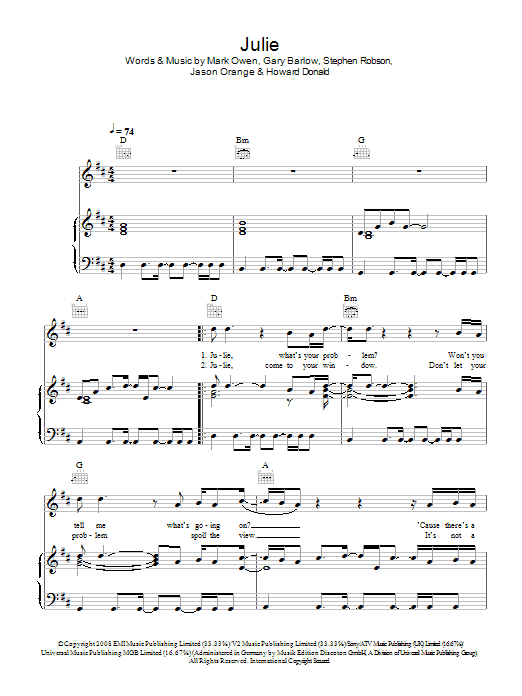 Download or print Take That Julie sheet music, chords and digital score arranged for Piano, Vocal & Guitar Chords. This Pop score includes 5 page(s).