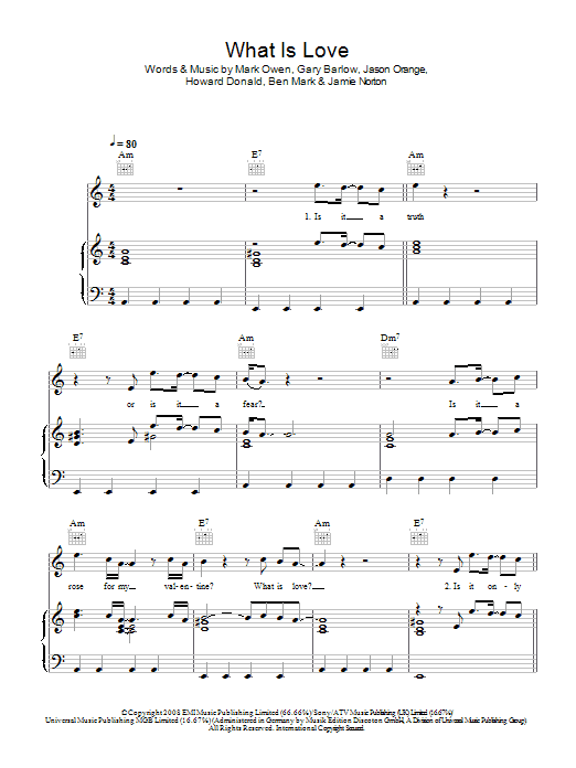 Download or print Take That What Is Love sheet music, chords and digital score arranged for Piano, Vocal & Guitar Chords. This Pop score includes 4 page(s).
