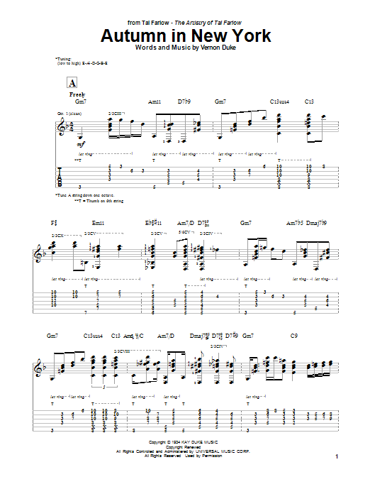 Download or print Tal Farlow Autumn In New York sheet music, chords and digital score arranged for Guitar Tab. This Jazz score includes 9 page(s).