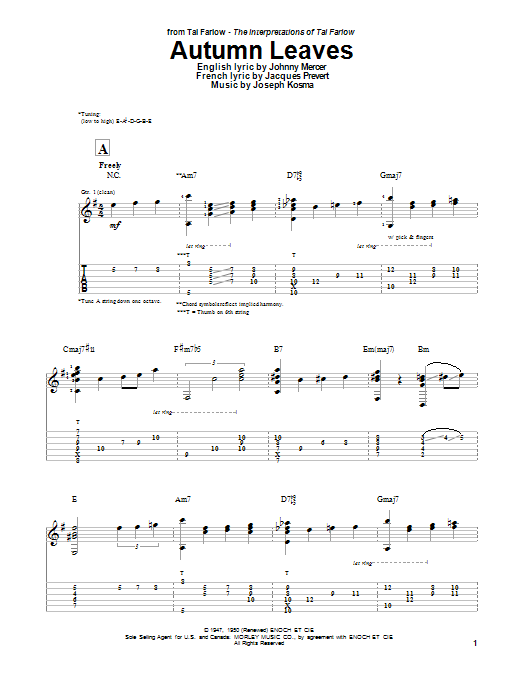 Download or print Tal Farlow Autumn Leaves sheet music, chords and digital score arranged for Guitar Tab. This Jazz score includes 4 page(s).