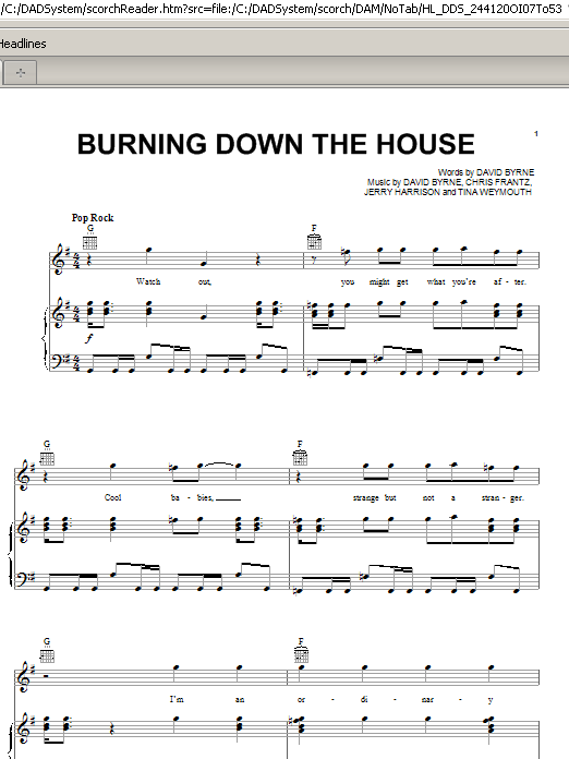 Download or print Talking Heads Burning Down The House sheet music, chords and digital score arranged for Drum Chart. This Pop score includes 1 page(s).