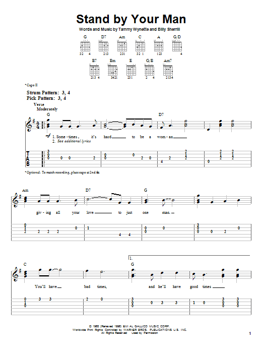 Download or print Tammy Wynette Stand By Your Man sheet music, chords and digital score arranged for Solo Guitar. This Country score includes 2 page(s).