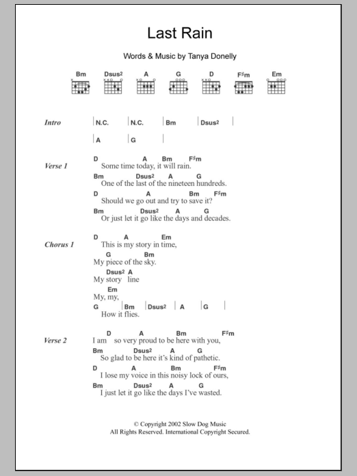 Download or print Tanya Donelly Last Rain sheet music, chords and digital score arranged for Guitar Chords/Lyrics. This Rock score includes 3 page(s).