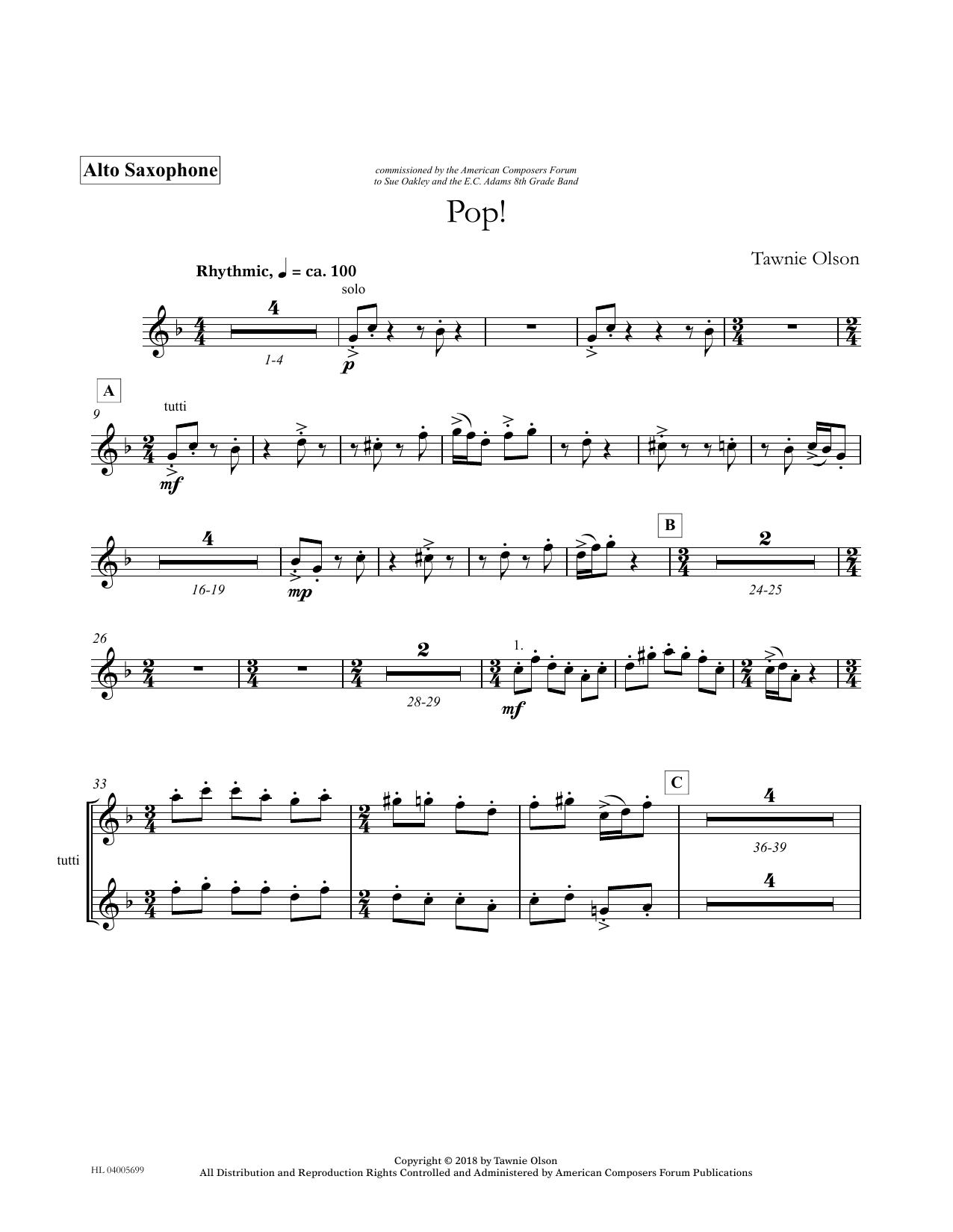 Download or print Tawnie Olson Pop! - Eb Alto Saxophone (Divisi) sheet music, chords and digital score arranged for Concert Band. This Concert score includes 3 page(s).