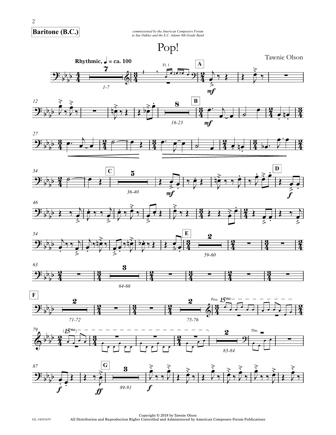 Download or print Tawnie Olson Pop! - Euphonium/Baritone BC sheet music, chords and digital score arranged for Concert Band. This Concert score includes 2 page(s).