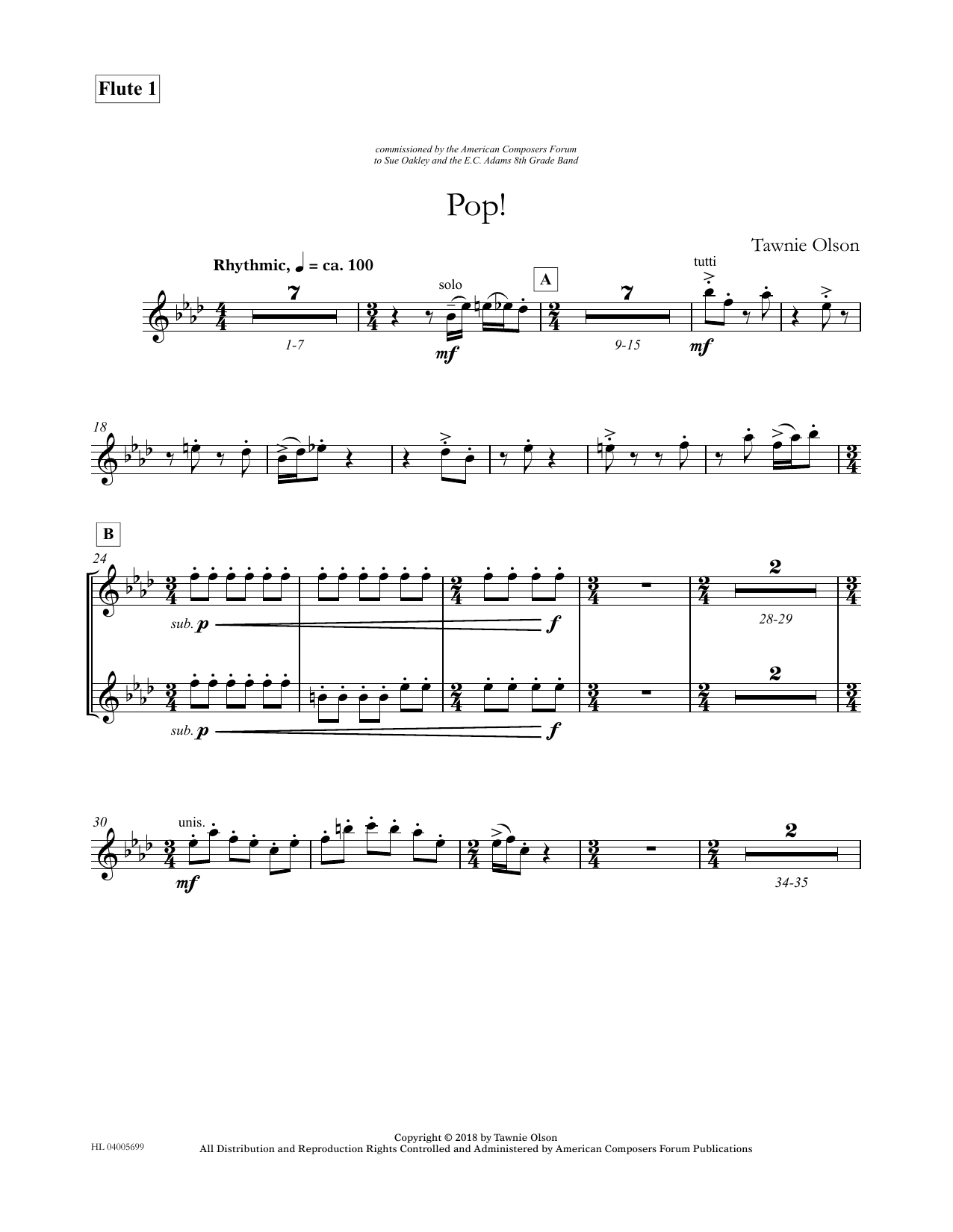 Download or print Tawnie Olson Pop! - Flute 1 (Divisi) sheet music, chords and digital score arranged for Concert Band. This Concert score includes 3 page(s).