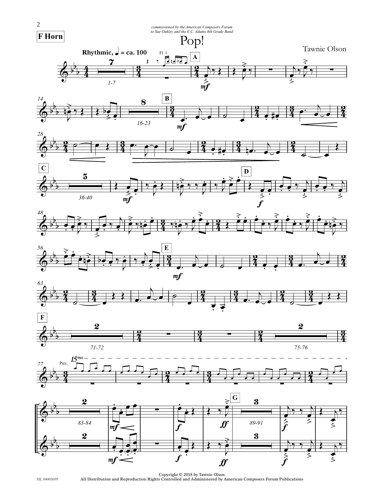 Download or print Tawnie Olson Pop! - French Horn (Divisi) sheet music, chords and digital score arranged for Concert Band. This Concert score includes 2 page(s).