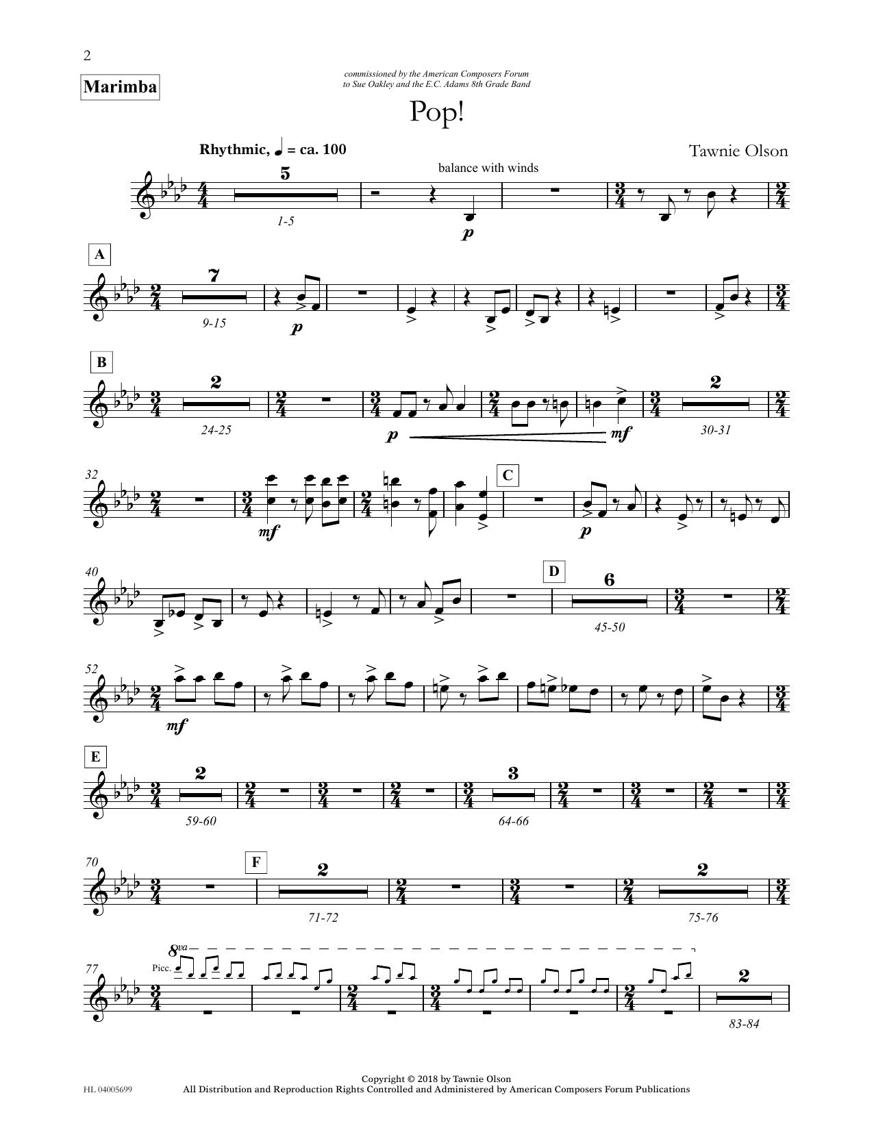 Download or print Tawnie Olson Pop! - Marimba sheet music, chords and digital score arranged for Concert Band. This Concert score includes 2 page(s).