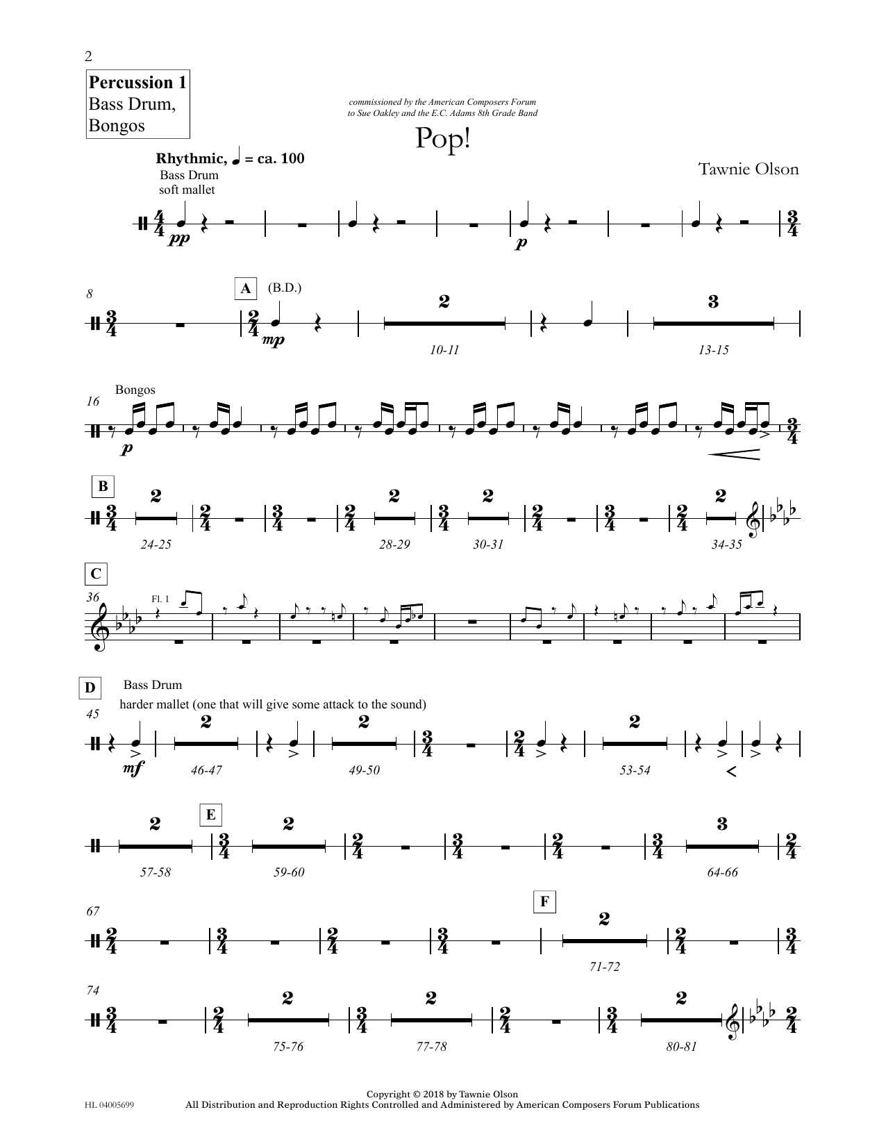 Download or print Tawnie Olson Pop! - Percussion 1 Bass Drum, Bongo sheet music, chords and digital score arranged for Concert Band. This Concert score includes 2 page(s).