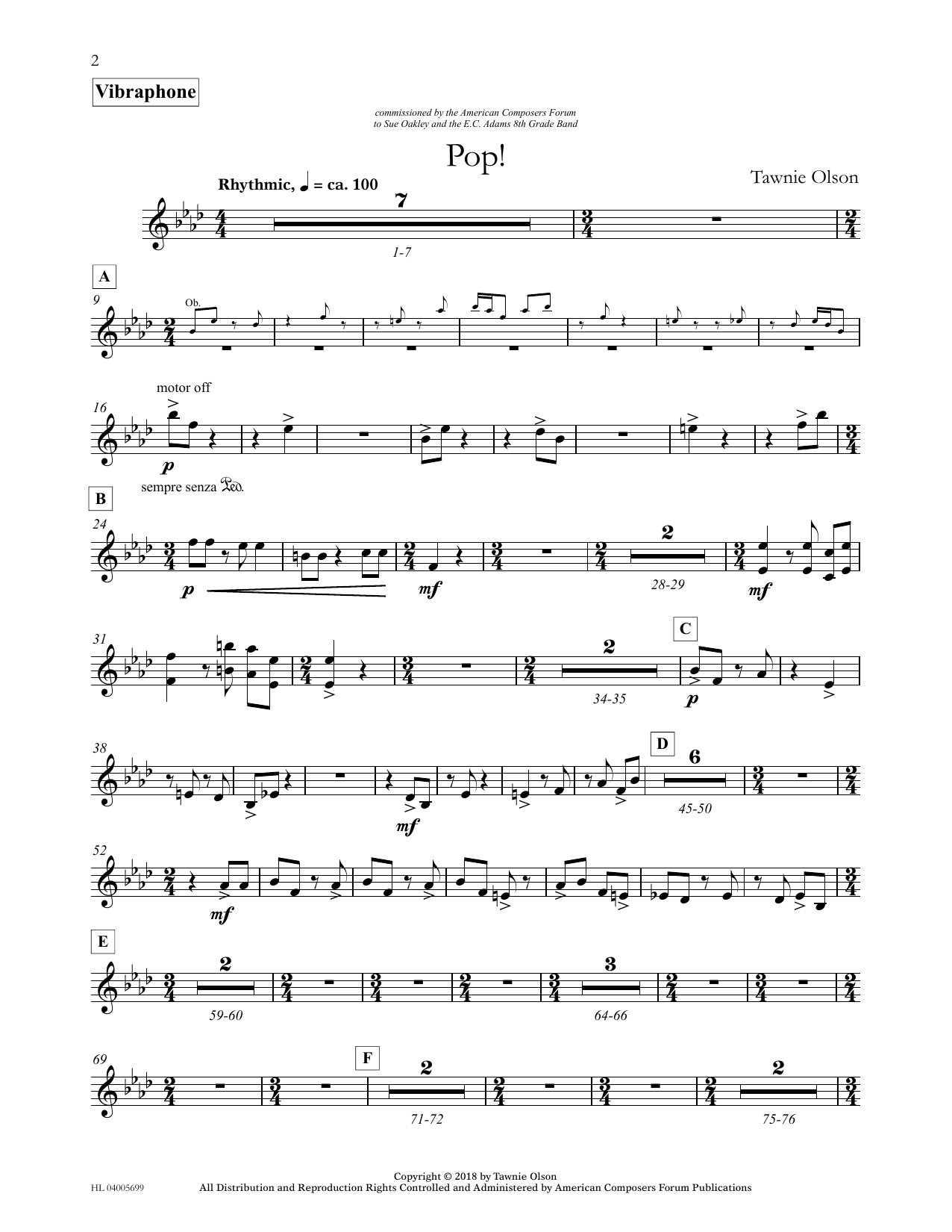 Download or print Tawnie Olson Pop! - Vibraphone sheet music, chords and digital score arranged for Concert Band. This Concert score includes 2 page(s).