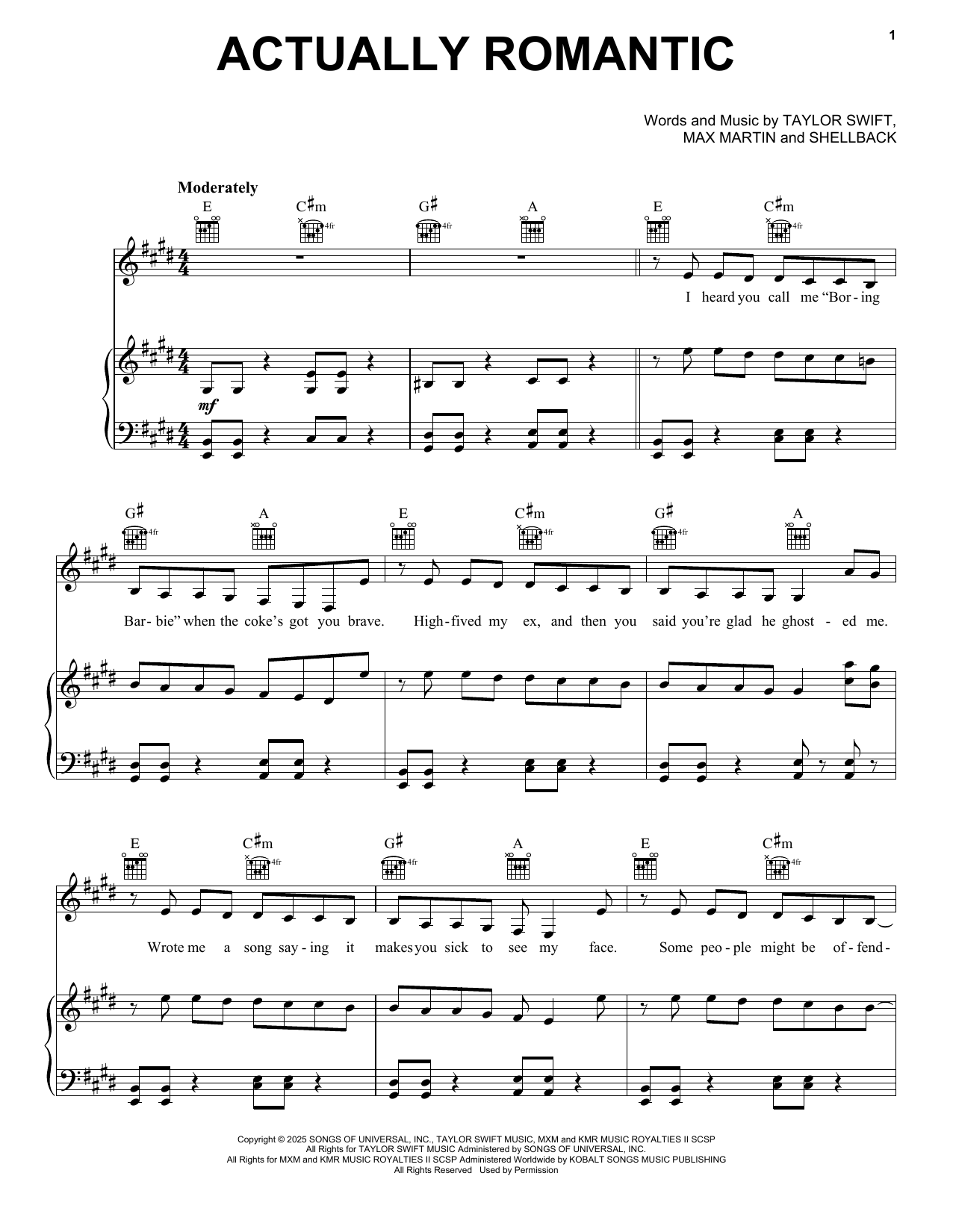 Download or print Taylor Swift Actually Romantic sheet music, chords and digital score arranged for Piano, Vocal & Guitar Chords (Right-Hand Melody). This Pop score includes 6 page(s).