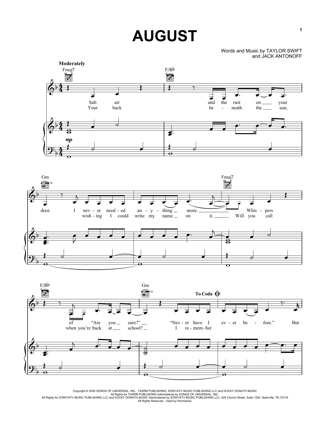 Download or print Taylor Swift august sheet music, chords and digital score arranged for Piano, Vocal & Guitar Chords (Right-Hand Melody). This Folk score includes 8 page(s).