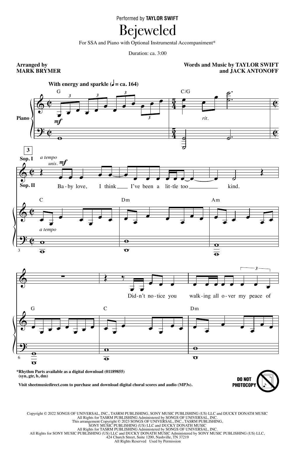 Download or print Taylor Swift Bejeweled (arr. Mark Brymer) sheet music, chords and digital score arranged for SSA Choir. This Pop score includes 14 page(s).