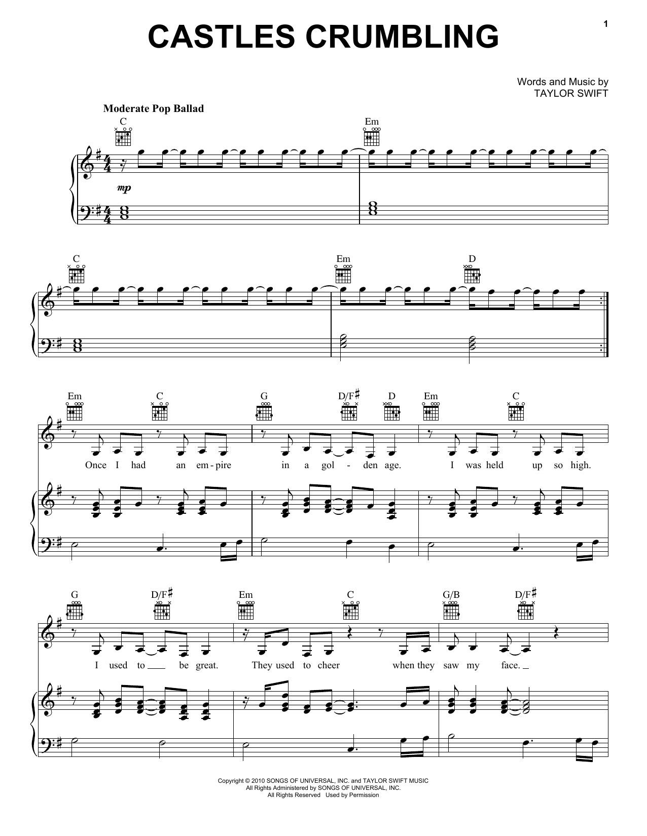Download or print Taylor Swift Castles Crumbling (feat. Hayley Williams) (Taylor's Version) (From The Vault) sheet music, chords and digital score arranged for Piano, Vocal & Guitar Chords (Right-Hand Melody). This Pop score includes 8 page(s).