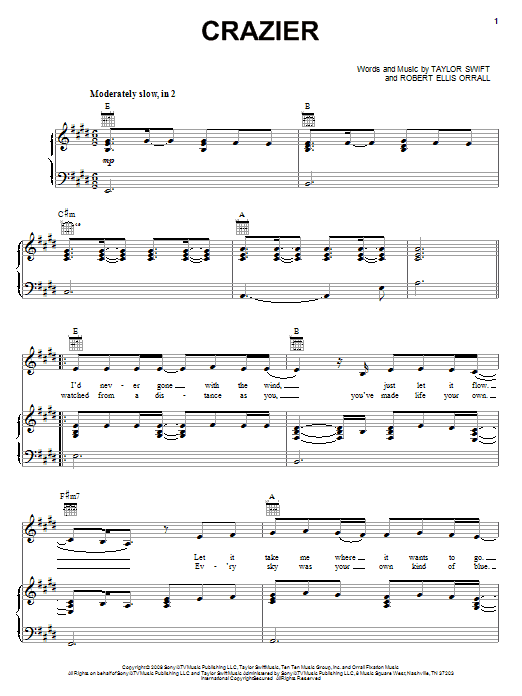 Download or print Taylor Swift Crazier sheet music, chords and digital score arranged for Easy Piano. This Country score includes 2 page(s).