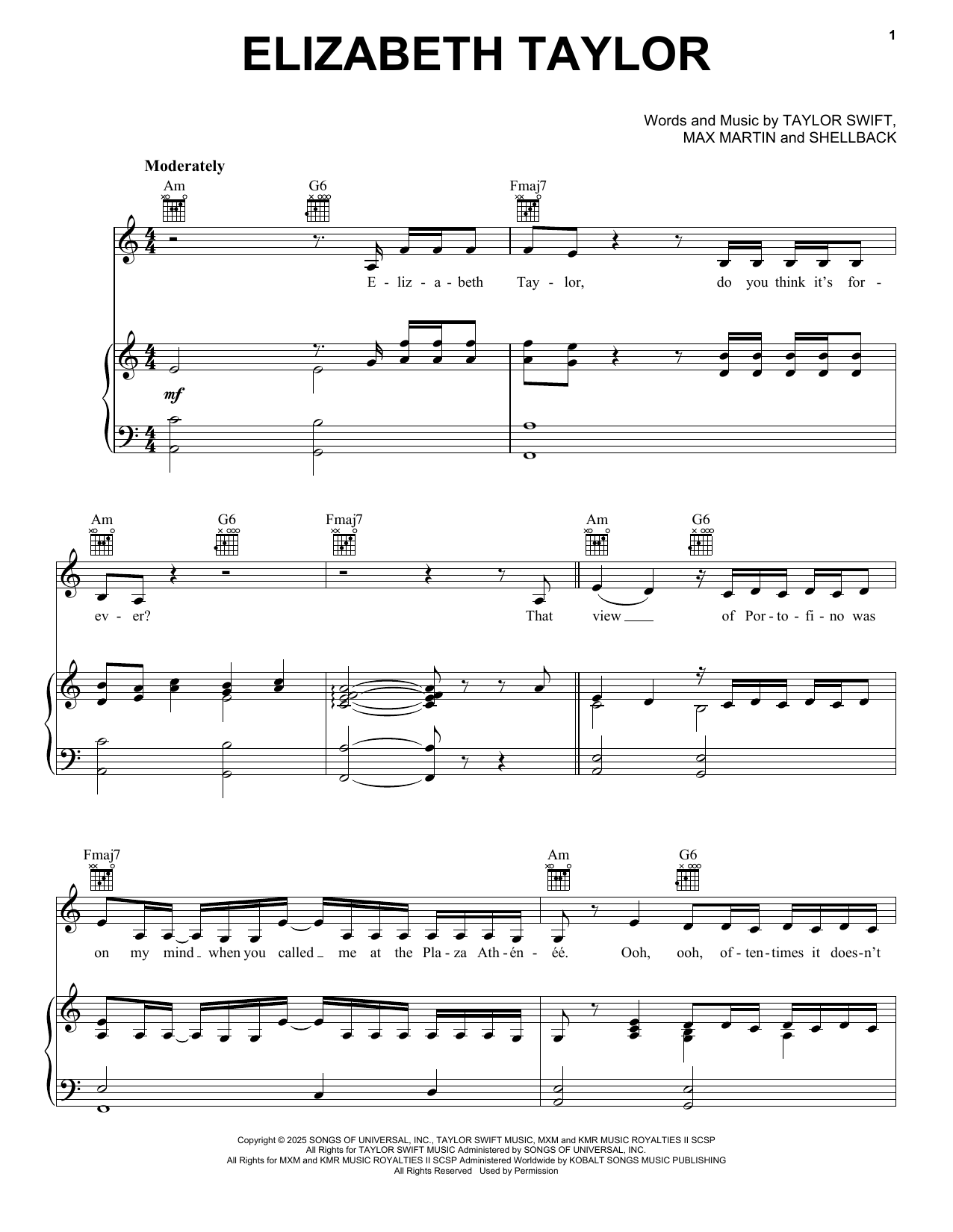 Download or print Taylor Swift Elizabeth Taylor sheet music, chords and digital score arranged for Piano, Vocal & Guitar Chords (Right-Hand Melody). This Pop score includes 8 page(s).