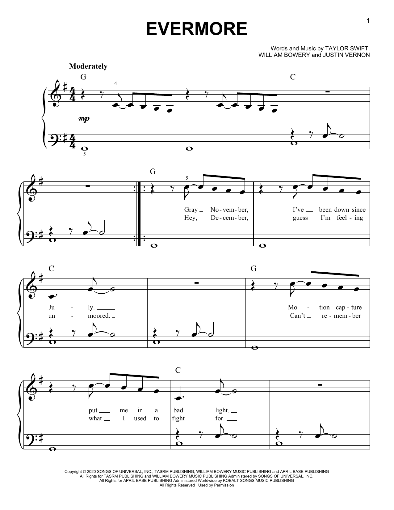 Download or print Taylor Swift evermore (feat. Bon Iver) sheet music, chords and digital score arranged for Super Easy Piano. This Pop score includes 2 page(s).
