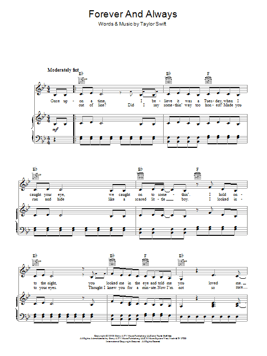 Download or print Taylor Swift Forever And Always sheet music, chords and digital score arranged for Piano, Vocal & Guitar Chords. This Country score includes 7 page(s).