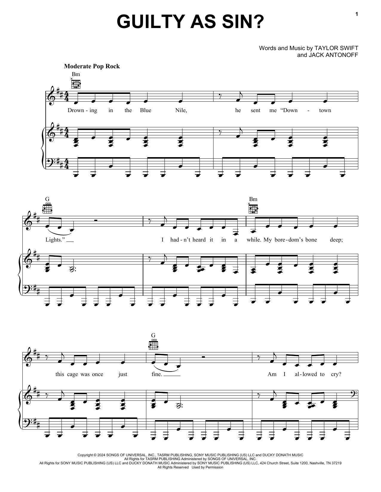 Download or print Taylor Swift Guilty as Sin? sheet music, chords and digital score arranged for Easy Piano. This Pop score includes 6 page(s).