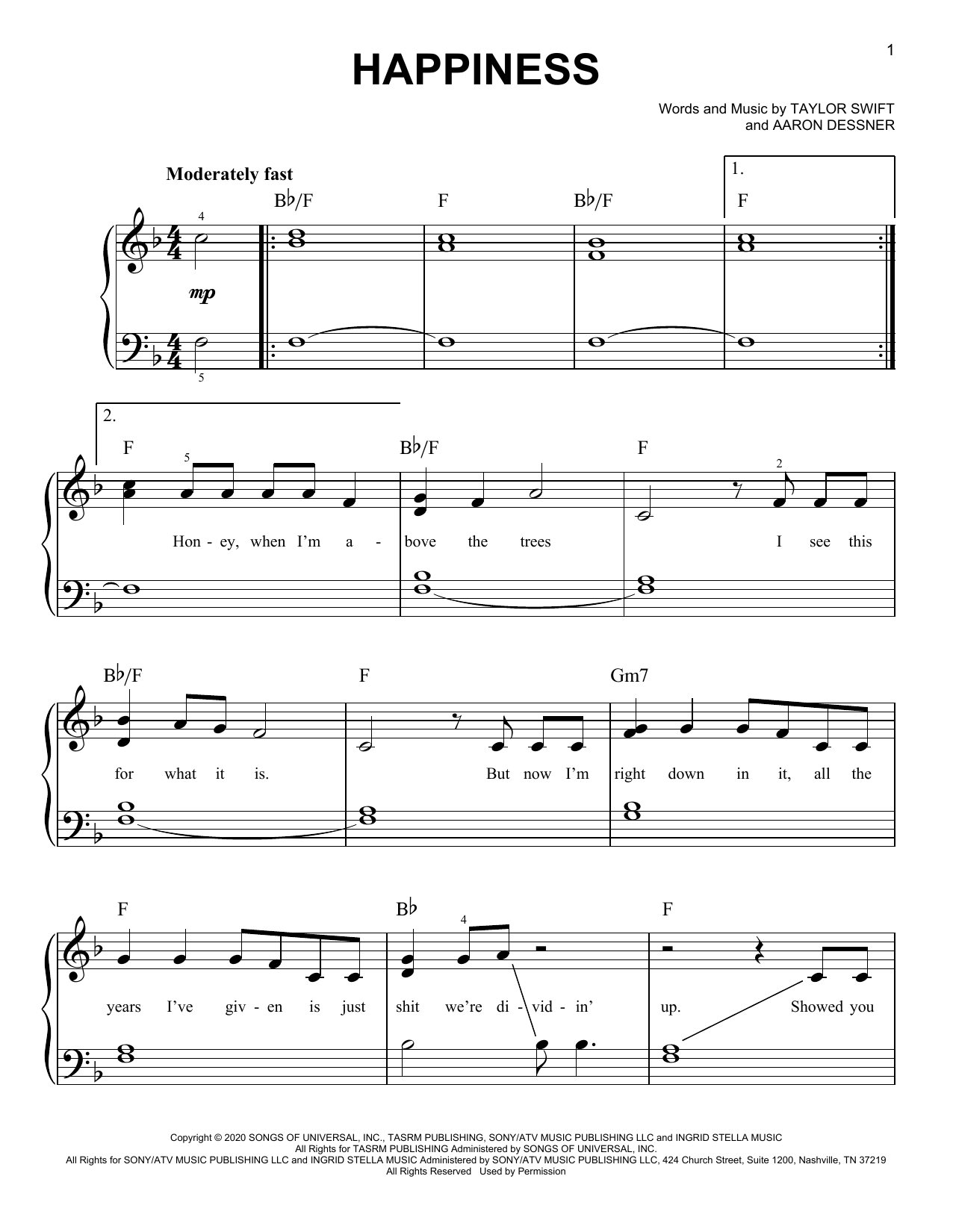 Download or print Taylor Swift happiness sheet music, chords and digital score arranged for Easy Piano. This Pop score includes 8 page(s).