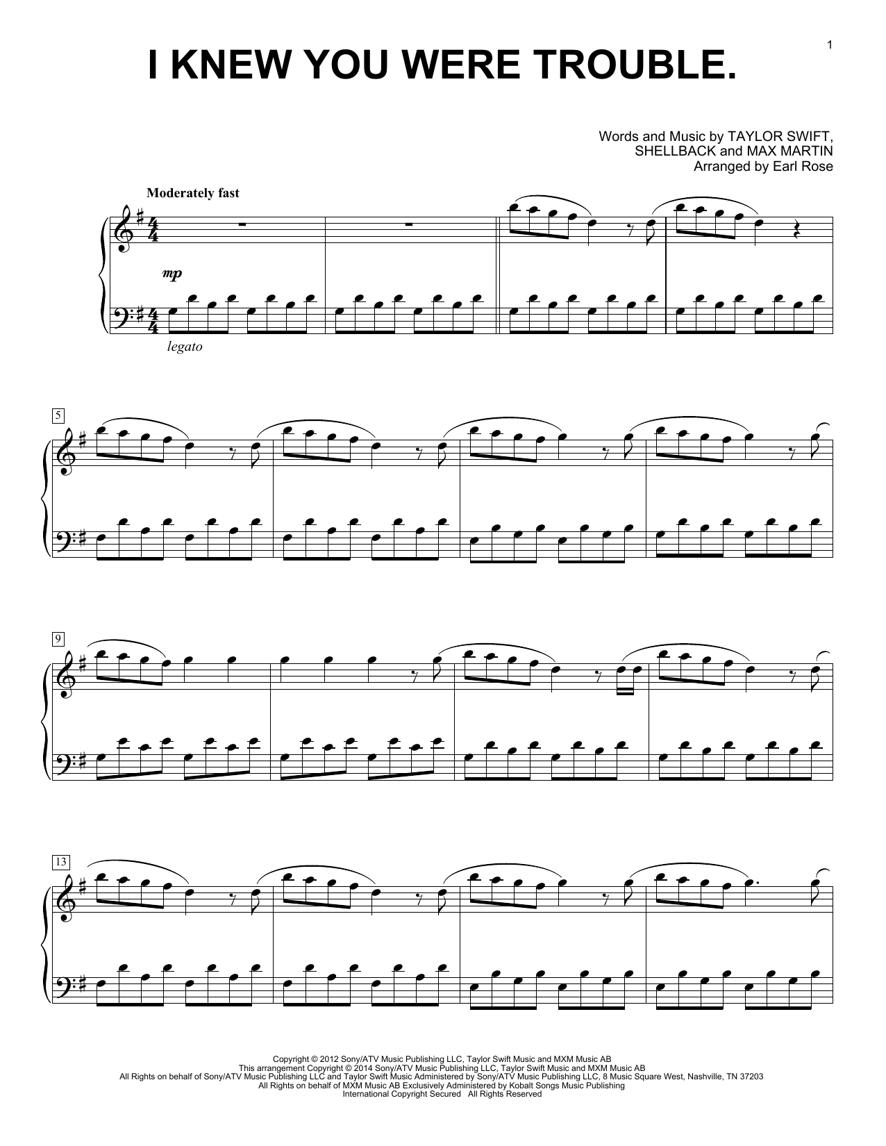 Download or print Earl Rose I Knew You Were Trouble. sheet music, chords and digital score arranged for Piano Solo. This Pop score includes 4 page(s).
