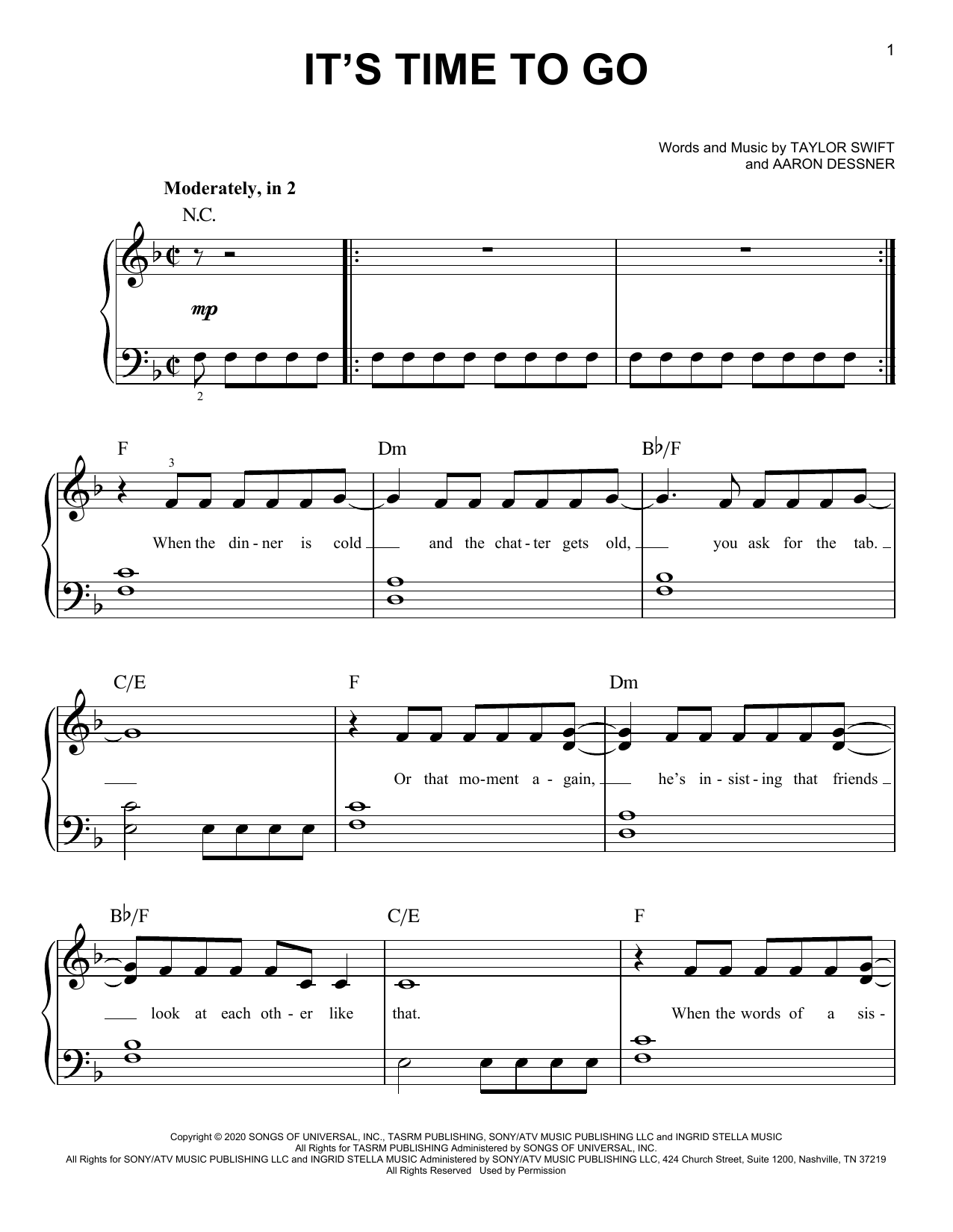Download or print Taylor Swift it's time to go sheet music, chords and digital score arranged for Easy Piano. This Pop score includes 9 page(s).