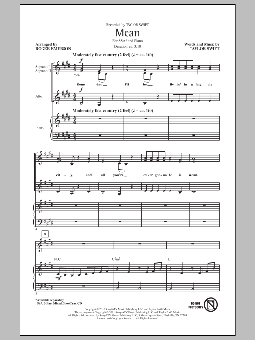 Download or print Taylor Swift Mean (arr. Roger Emerson) sheet music, chords and digital score arranged for 3-Part Mixed Choir. This Country score includes 15 page(s).