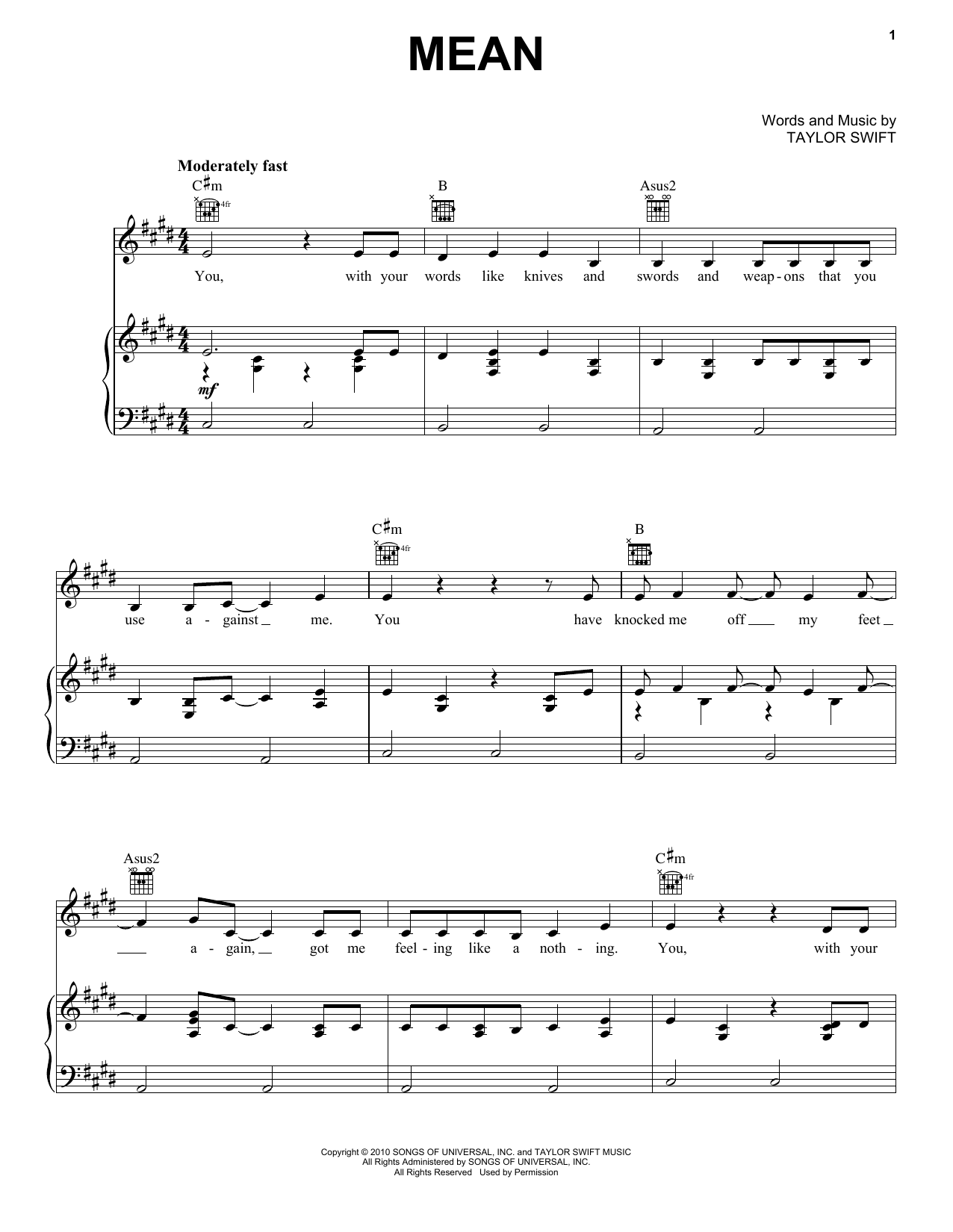 Download or print Taylor Swift Mean sheet music, chords and digital score arranged for Cello Solo. This Pop score includes 2 page(s).