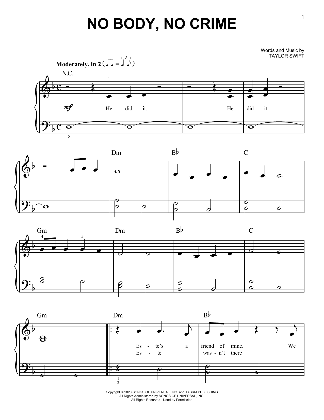 Download or print Taylor Swift no body, no crime (feat. HAIM) sheet music, chords and digital score arranged for Guitar Chords/Lyrics. This Pop score includes 3 page(s).