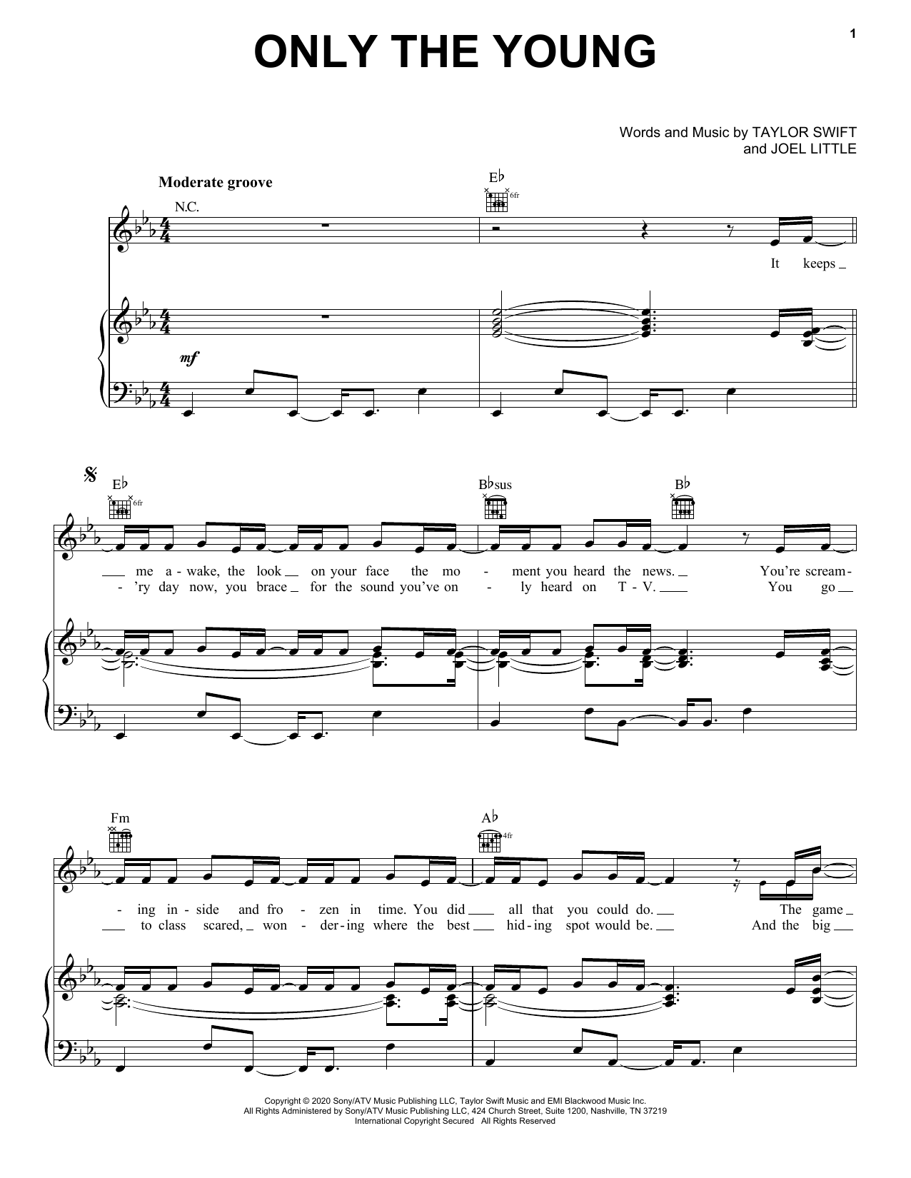 Download or print Taylor Swift Only The Young (from Miss Americana) sheet music, chords and digital score arranged for Piano, Vocal & Guitar Chords (Right-Hand Melody). This Pop score includes 6 page(s).
