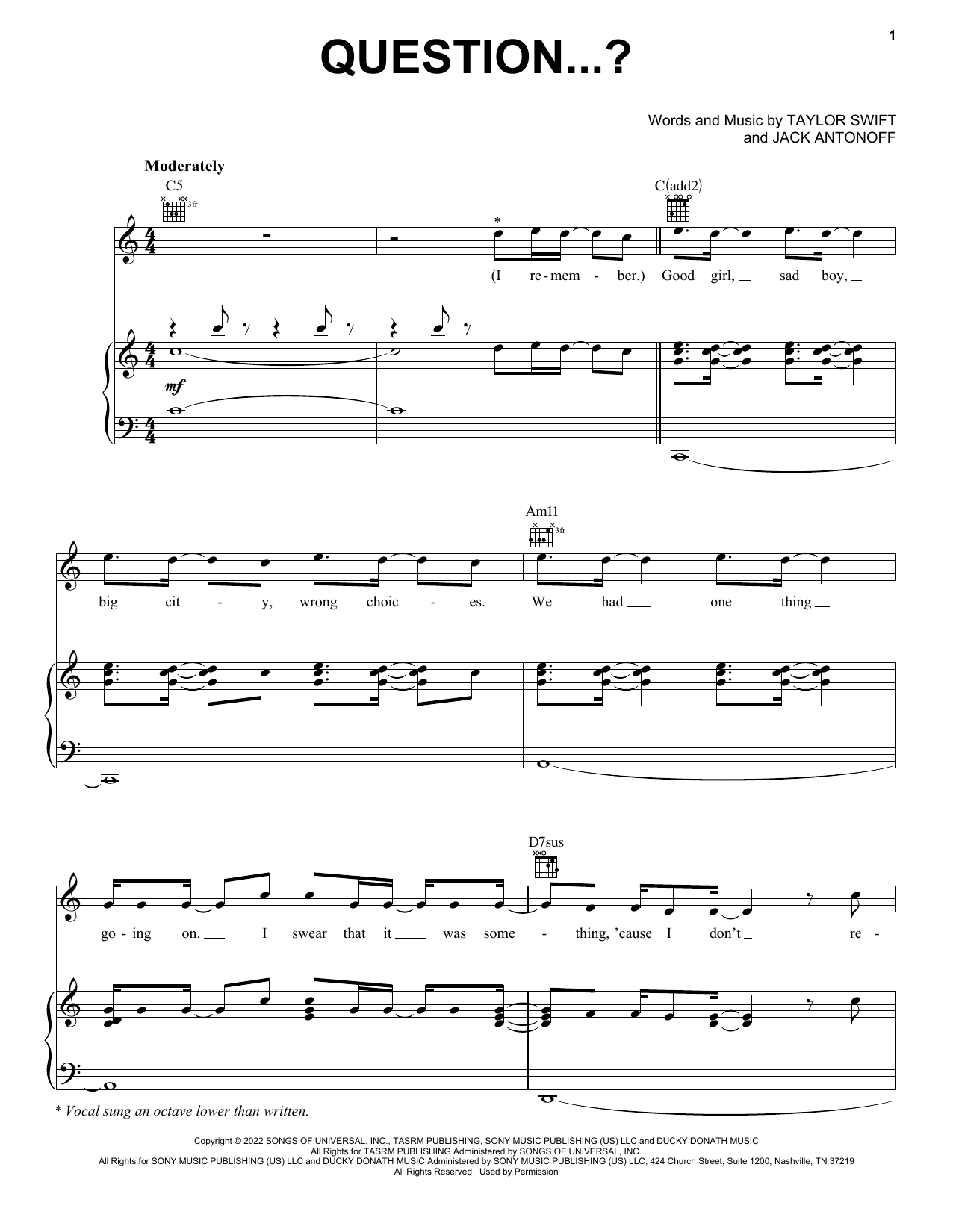 Download or print Taylor Swift Question...? sheet music, chords and digital score arranged for Piano, Vocal & Guitar Chords (Right-Hand Melody). This Pop score includes 9 page(s).