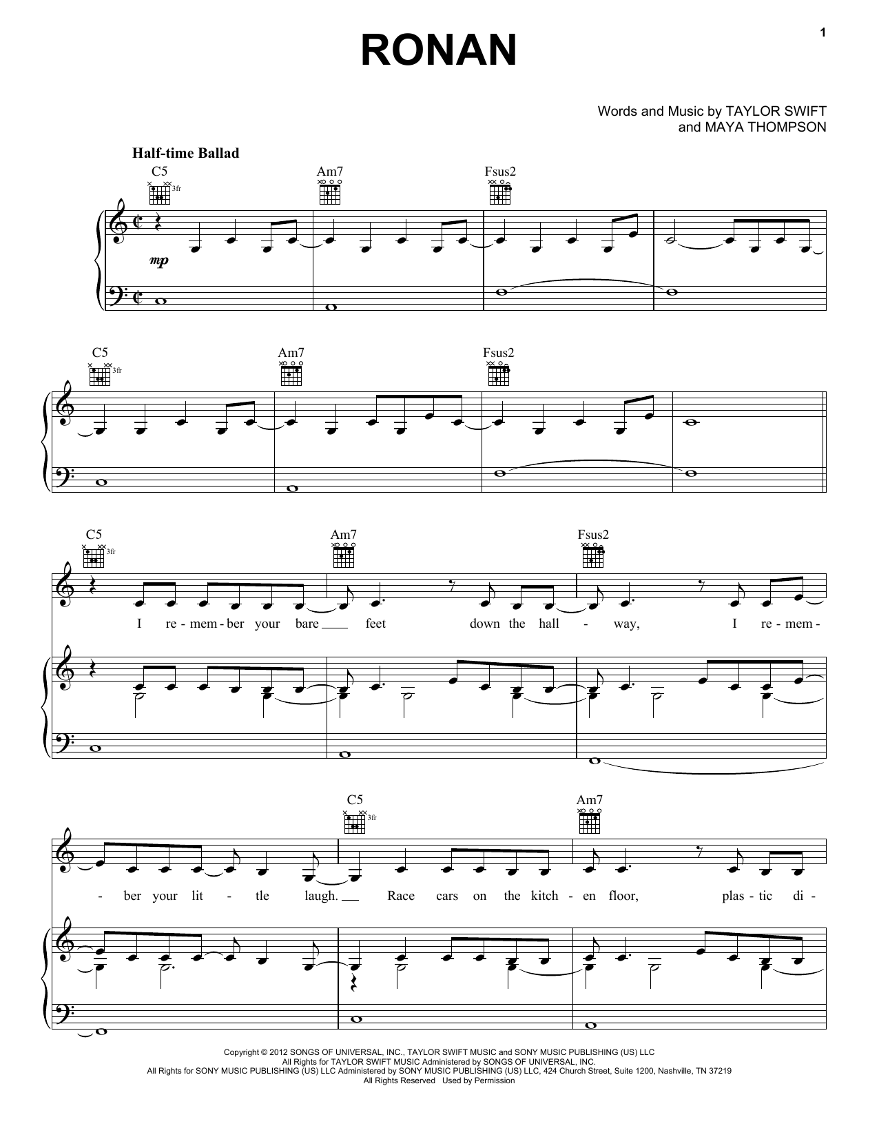 Download or print Taylor Swift Ronan (Taylor's Version) sheet music, chords and digital score arranged for Piano, Vocal & Guitar Chords (Right-Hand Melody). This Country score includes 8 page(s).