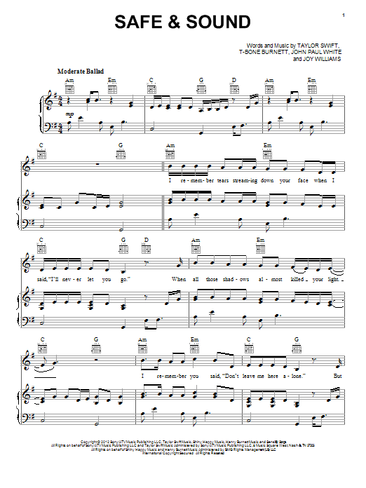 Download or print Taylor Swift Safe & Sound (feat. The Civil Wars) (from The Hunger Games) sheet music, chords and digital score arranged for Piano, Vocal & Guitar Chords (Right-Hand Melody). This Pop score includes 6 page(s).