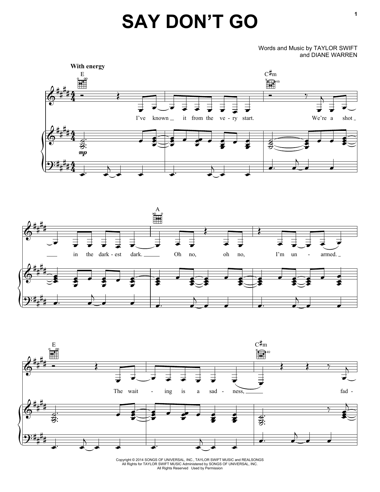 Download or print Taylor Swift Say Don't Go (Taylor's Version) (From The Vault) sheet music, chords and digital score arranged for Piano, Vocal & Guitar Chords (Right-Hand Melody). This Pop score includes 8 page(s).