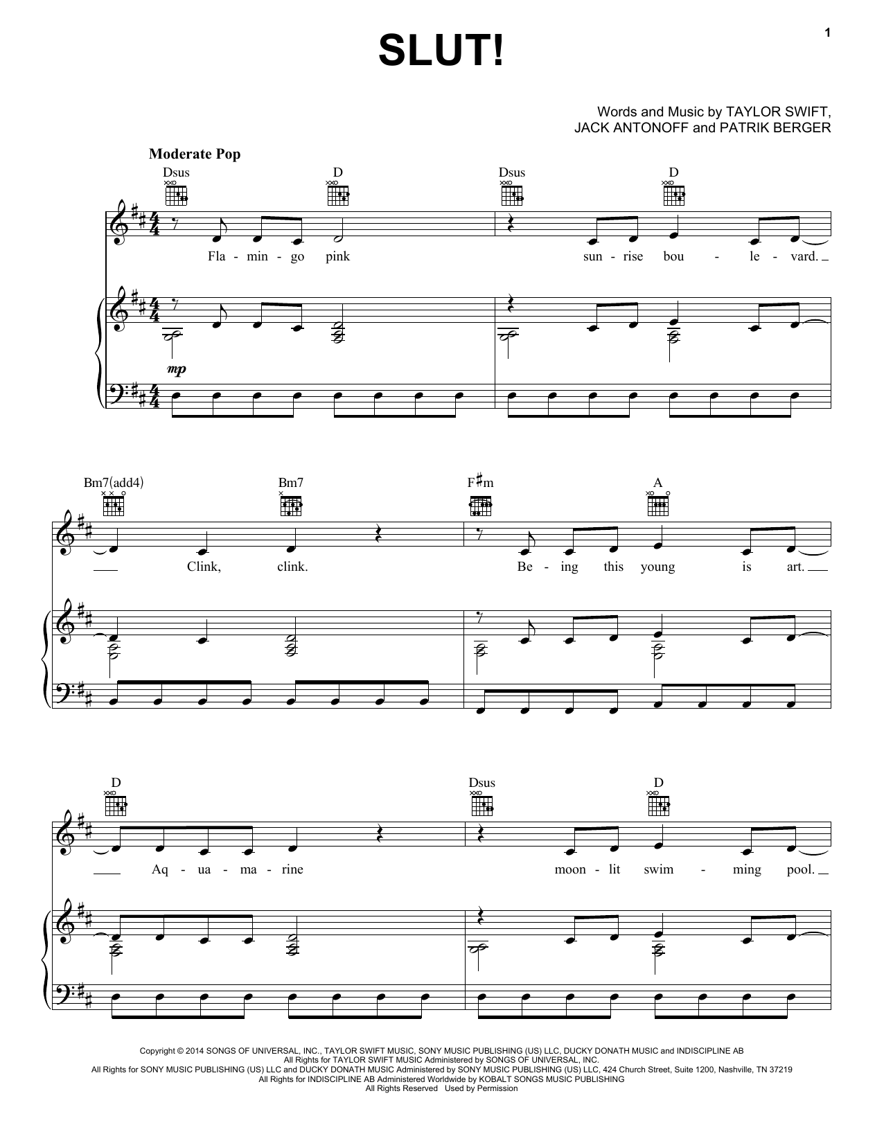 Download or print Taylor Swift Slut! (Taylor's Version) (From The Vault) sheet music, chords and digital score arranged for Piano, Vocal & Guitar Chords (Right-Hand Melody). This Pop score includes 6 page(s).