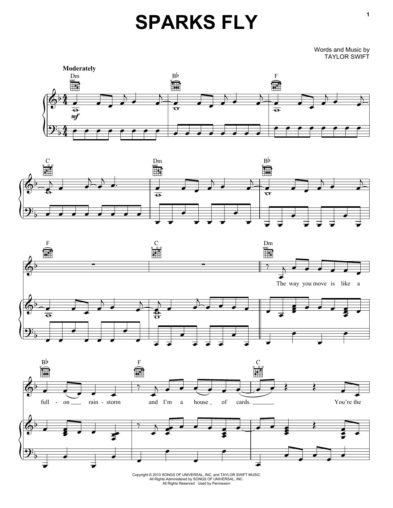 Download or print Taylor Swift Sparks Fly sheet music, chords and digital score arranged for Piano, Vocal & Guitar Chords (Right-Hand Melody). This Country score includes 9 page(s).