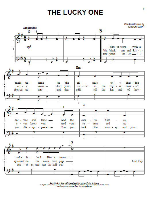 Download or print Taylor Swift The Lucky One sheet music, chords and digital score arranged for Guitar Tab. This Country score includes 9 page(s).