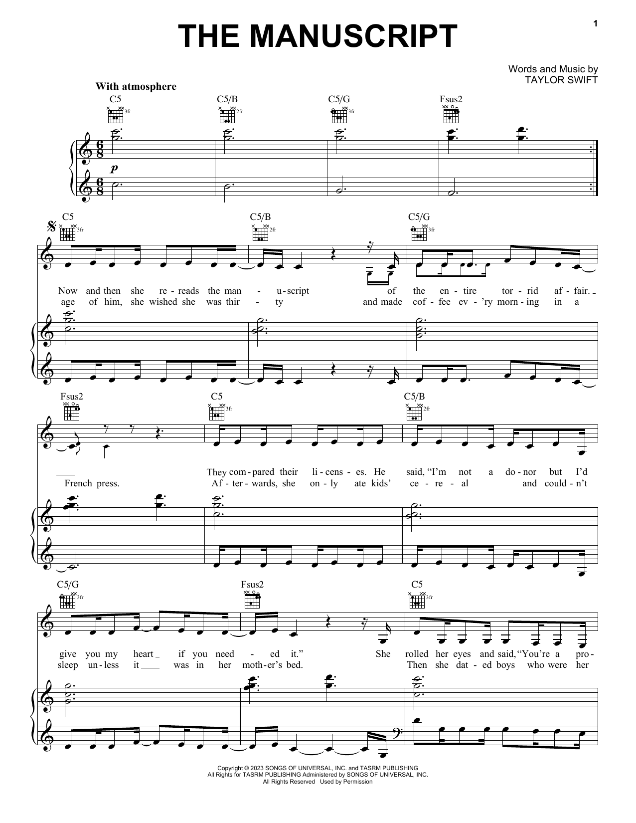 Download or print Taylor Swift The Manuscript sheet music, chords and digital score arranged for Guitar Chords/Lyrics. This Pop score includes 3 page(s).